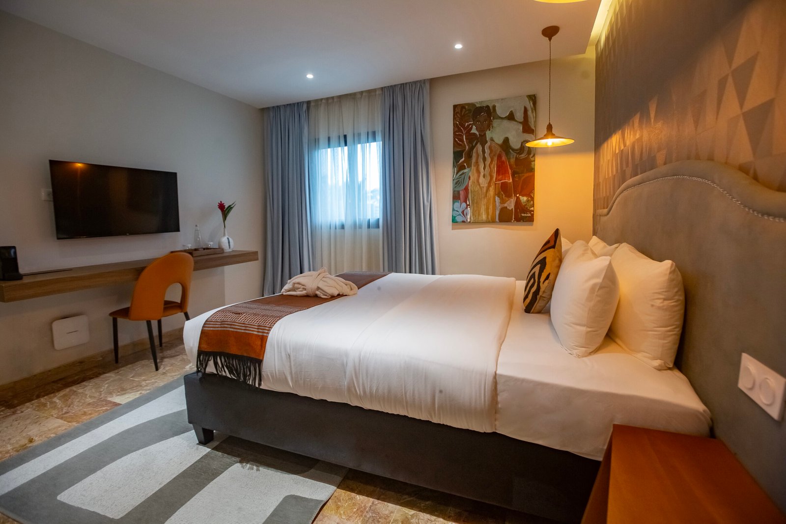 The Adjiri room envelops you in a cozy atmosphere, ideal for travelers seeking peace and comfort. Its built-in walk-in closet adds a touch of practicality.